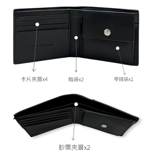 內裡:鈔票夾層x2 卡片夾層x4 暗袋x2 零錢袋x1