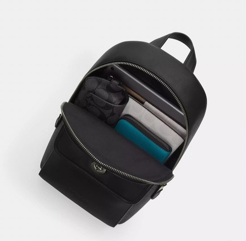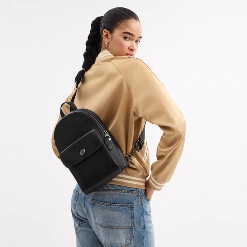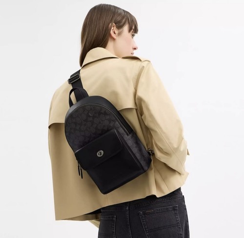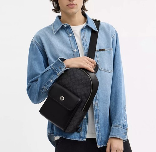 Coach Turnlock轉釦黑灰老花拼皮革小胸包單肩背包