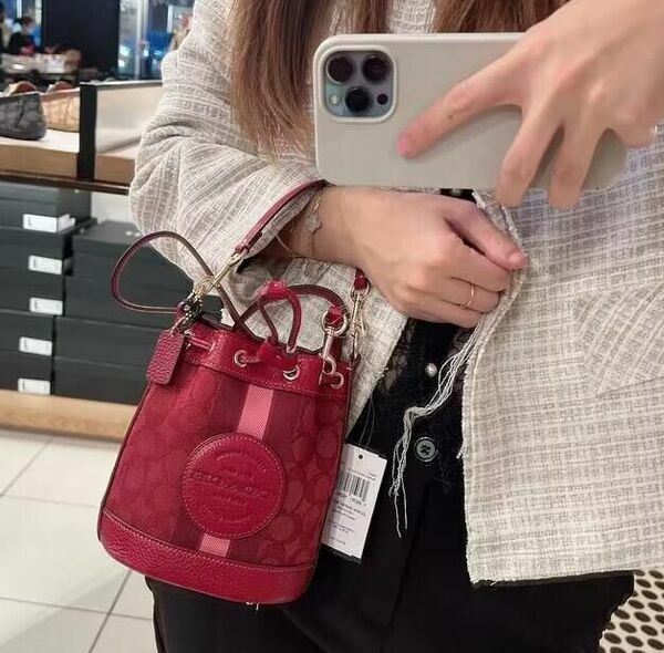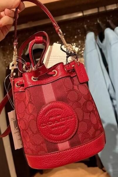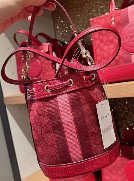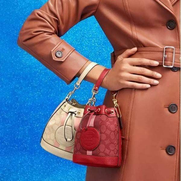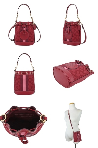 COACH 大圓標logo直紋拼接織布兩用水桶包