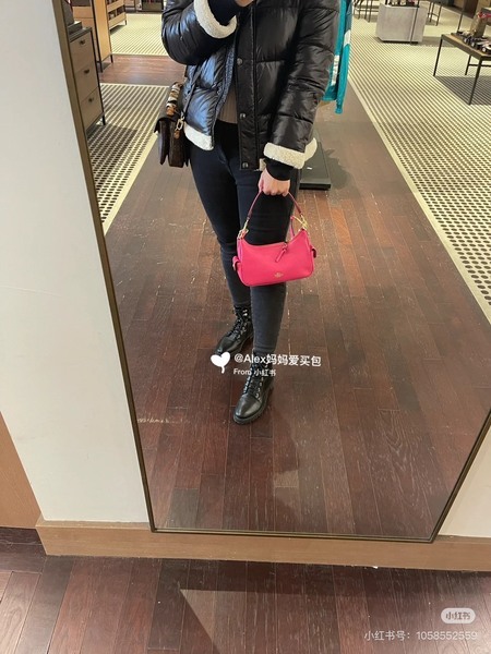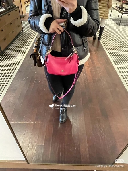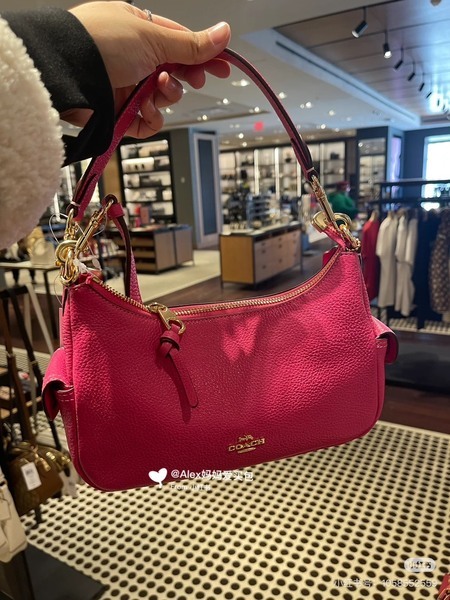 COACH 金馬車LOGO桃紅色荔枝紋皮革雙側口袋兩用包。