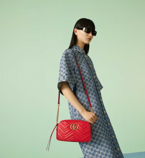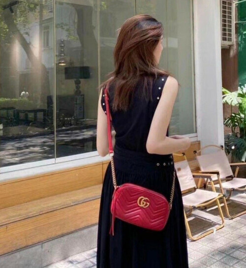 可在肩背和手提之間自由轉換。採用波浪紋絎縫皮革,背面配以GG 標誌。