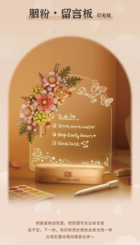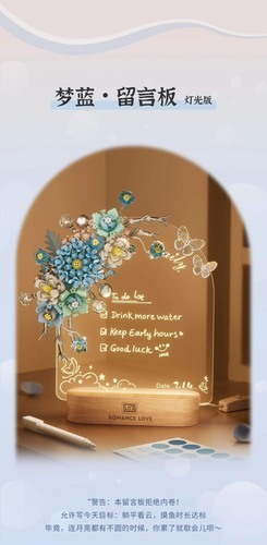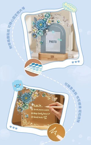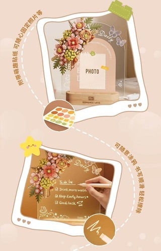 包含立體花束、蝴蝶裝飾、透明留言板、白板筆,以及LED 木質燈座。