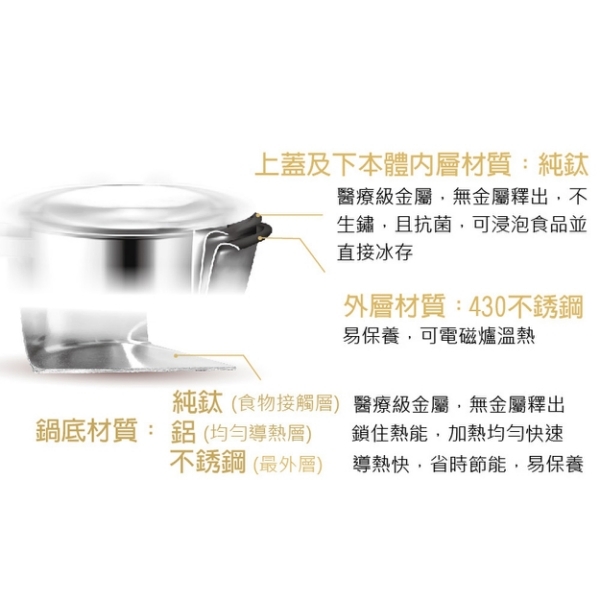 材質:純鈦、底部全包底(18/0不銹鋼、鋁片均勻導熱)、水晶玻璃