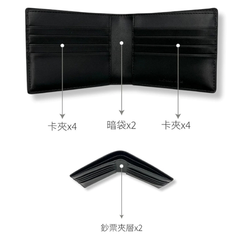 短夾內裡:鈔票夾層x2 卡片夾層x8 暗袋x2