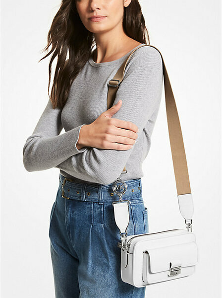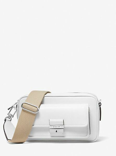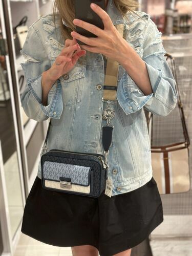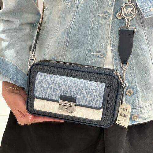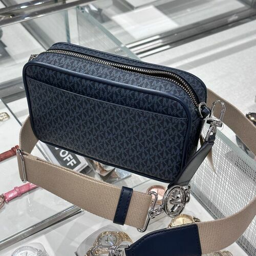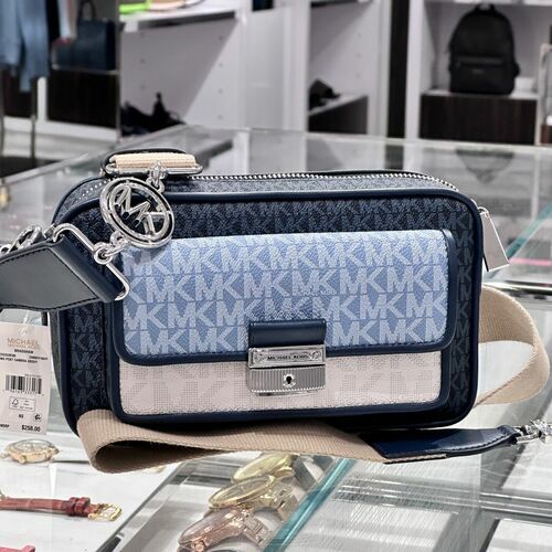Michael Kors 專櫃款 香布雷老花logo前釦口袋拉鍊寬背帶相機包