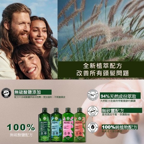 蘊含水解天然白羽扇豆種籽精華、有機龍舌蘭精萃及維他命E,配方不含硫酸鹽,溫和清潔頭髮,同時鞏固髮根。