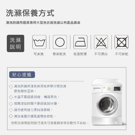 可水洗/不可烘乾/不可漂白/勿使用強力漂白清潔劑/浸泡時間請勿超過30分鐘/建議可放入大型洗衣袋後再清洗