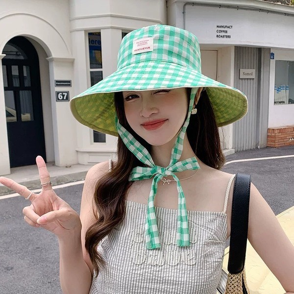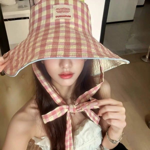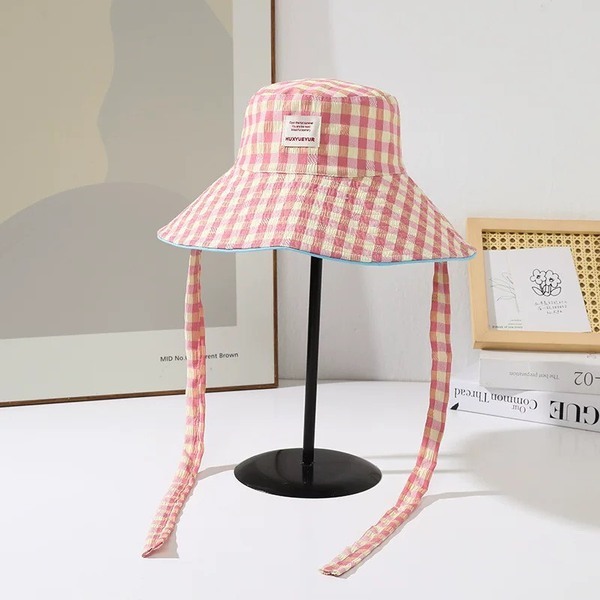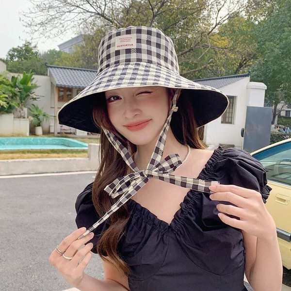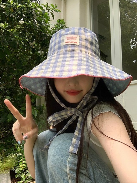 夏季防曬必備 韓版格紋寬邊抽繩漁夫帽