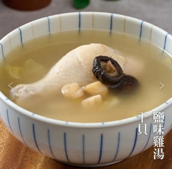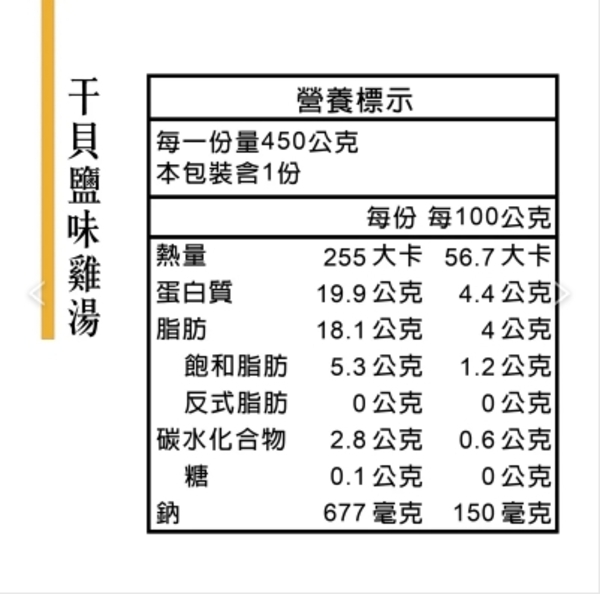 內容物:水、雞腿(台灣)、白菜、干貝、雞肉醬(雞肉)、鹽、雞油、麥芽糊精、水、酵母抽出物、芥花油、迷迭香抽出物)、乾香菇、薑、鹽