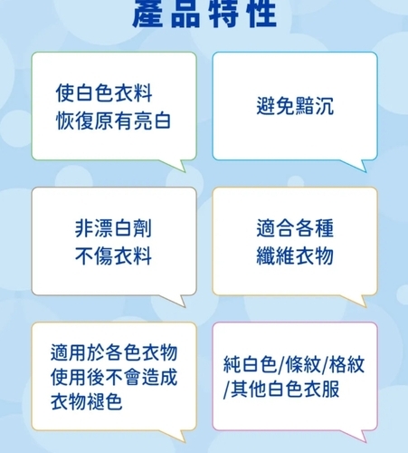 (例如:使用於黑白相間的衣物上,本品僅針對白色衣料恢復亮白,而黑色衣料不受影響。)