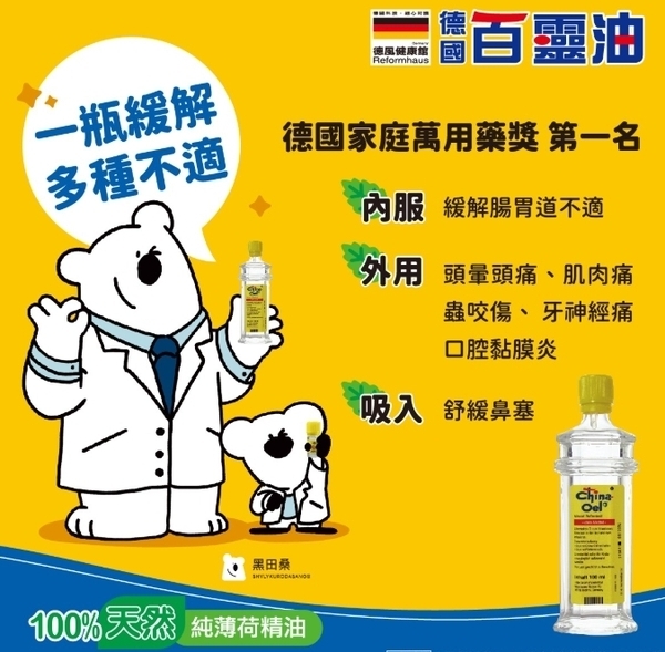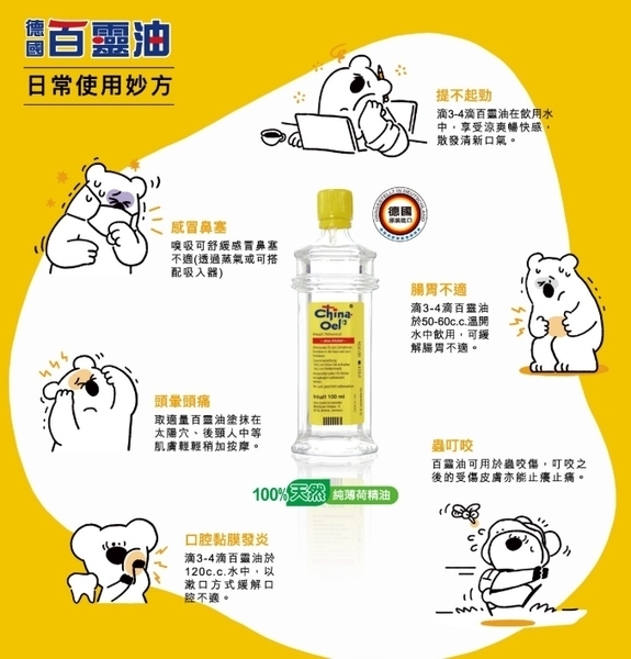 德國製造China Oel百靈萬用油系列為有效且無副作用的止痛專家,適用於各種疼痛及不適症狀。