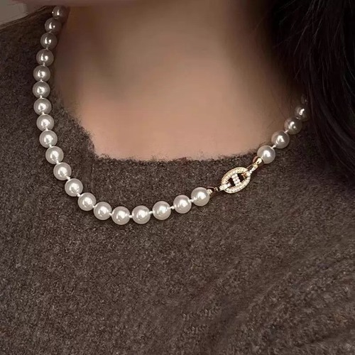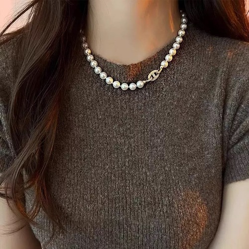 橢圓形鋯石豬鼻人造珍珠項鍊