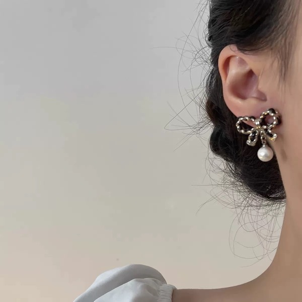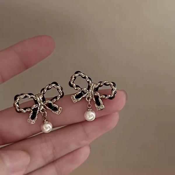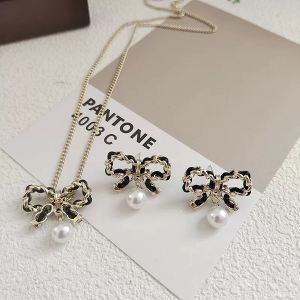 法式復古皮質蝴蝶結珍珠吊墜耳環項鍊套組