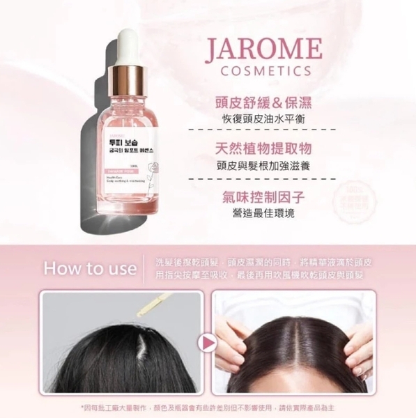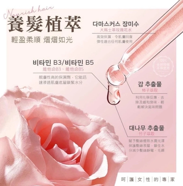 大馬士玫瑰水:採用珍稀的大馬士玫瑰精華,為頭皮注入豐沛水分,迅速舒緩乾癢與緊繃,讓你天天擁有水潤健康的頭皮狀態!
