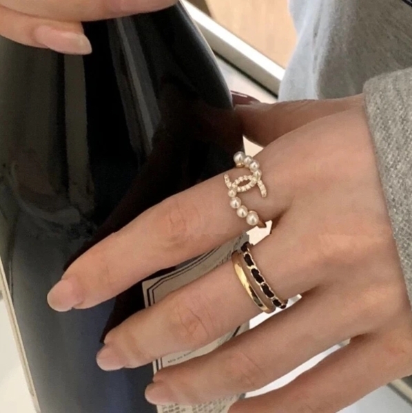 珍珠+雙層 小香風鑲鑽珍珠交叉戒指