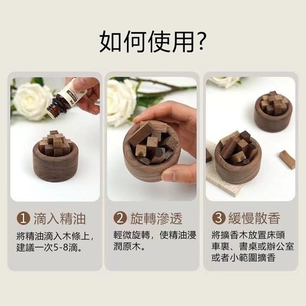 失眠的朋友建議使用擴散快的櫸木,若想要味道慢慢散開可以用吸收慢的黑胡桃木。