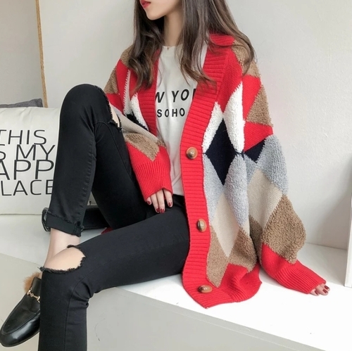 韓版慵懶寬鬆風菱格紋外套